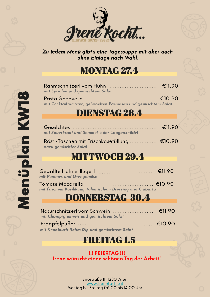 Irene kocht ist eine kleine, gemütliche Kantine in Wien, die von Irene mit viel Leidenschaft geführt wird. Unter dem Motto „einfach gutes Essen“ bietet sie ihren Gästen täglich frisch zubereitete, bodenständige Speisen. Der Fokus liegt auf hausgemachten Gerichten, ehrlicher Küche und einem freundlichen Ambiente – ideal für alle, die in der Mittagspause unkompliziert und gut essen möchten.
