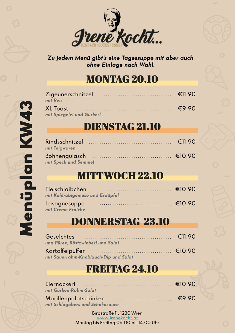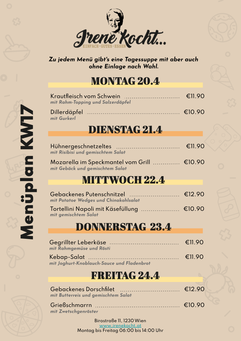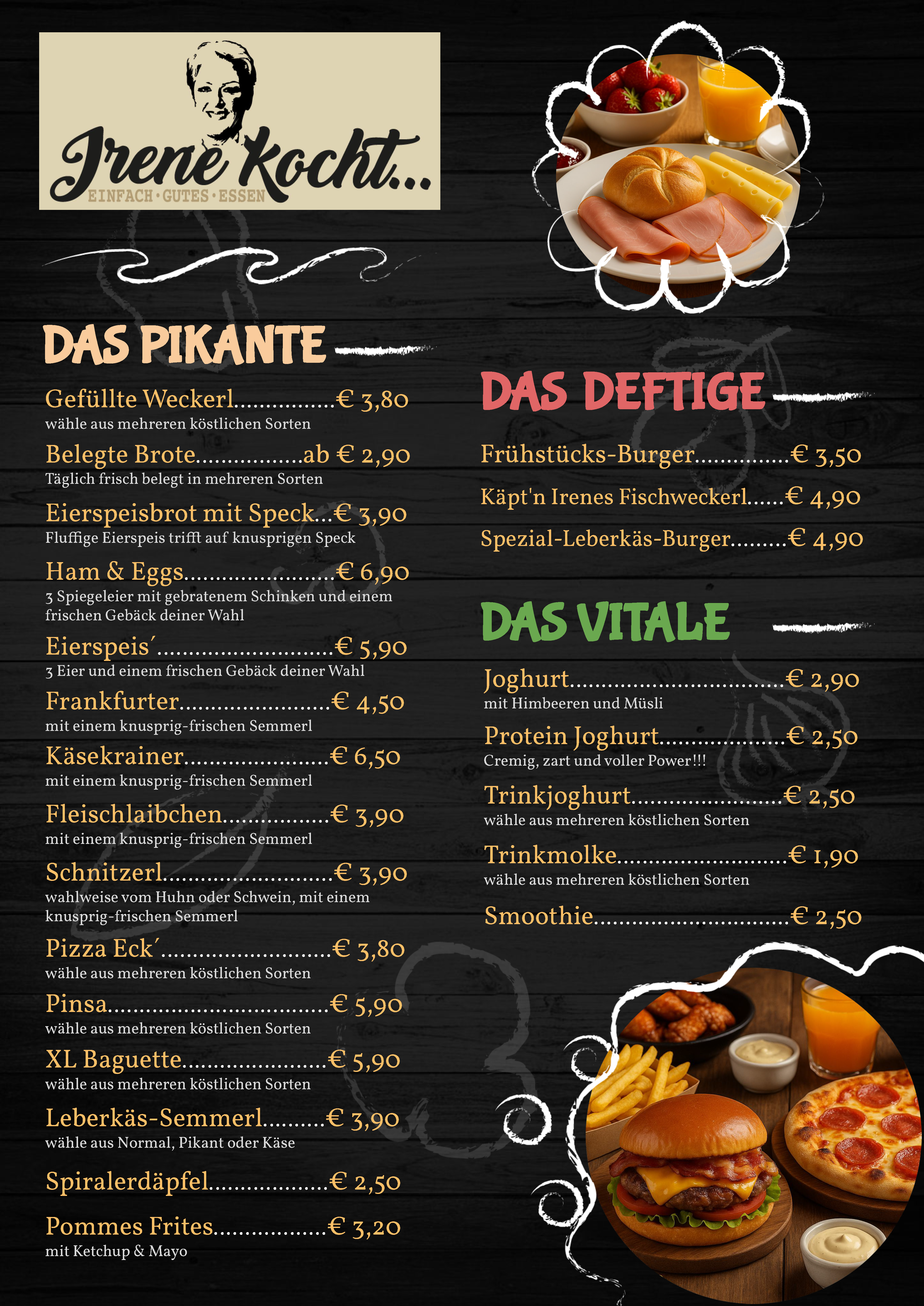 Irene kocht ist eine kleine, gemütliche Kantine in Wien, die von Irene mit viel Leidenschaft geführt wird. Unter dem Motto „einfach gutes Essen“ bietet sie ihren Gästen täglich frisch zubereitete, bodenständige Speisen. Der Fokus liegt auf hausgemachten Gerichten, ehrlicher Küche und einem freundlichen Ambiente – ideal für alle, die in der Mittagspause unkompliziert und gut essen möchten.